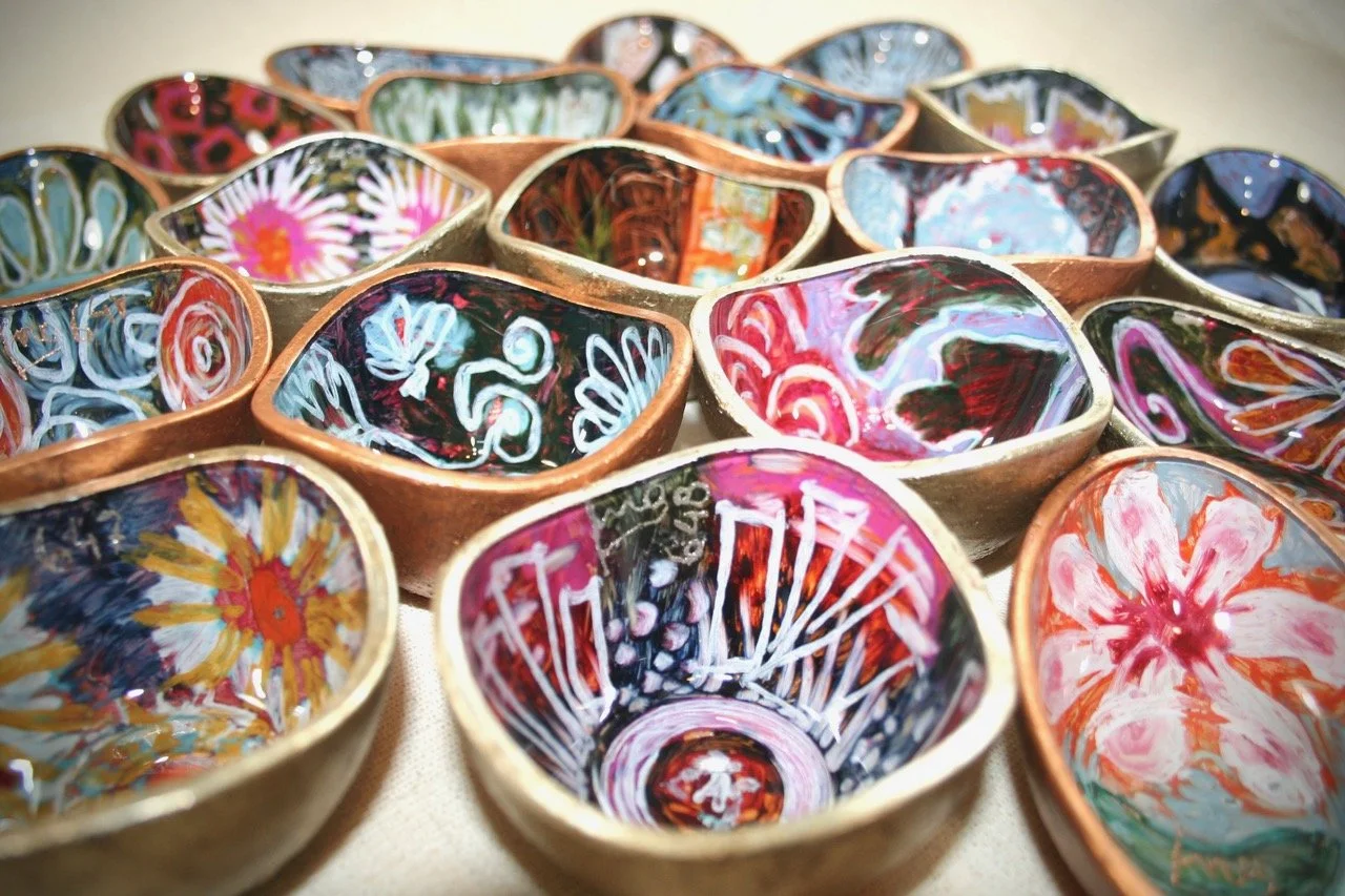 I am self-taught. For over 40 years, my many interests have made my path of development as a fine artist anything but straight. It builds upon itself as it meanders and delves into painting, plastering, modeling, and metal work. At the Artworks, my focus is vessels in verre églomisé and wall art ranging from charcoal drawings and reverse paintings on glass to venetian plaster. The medium doesn’t matter so much except as a vehicle for expressing my inner and outer worlds.